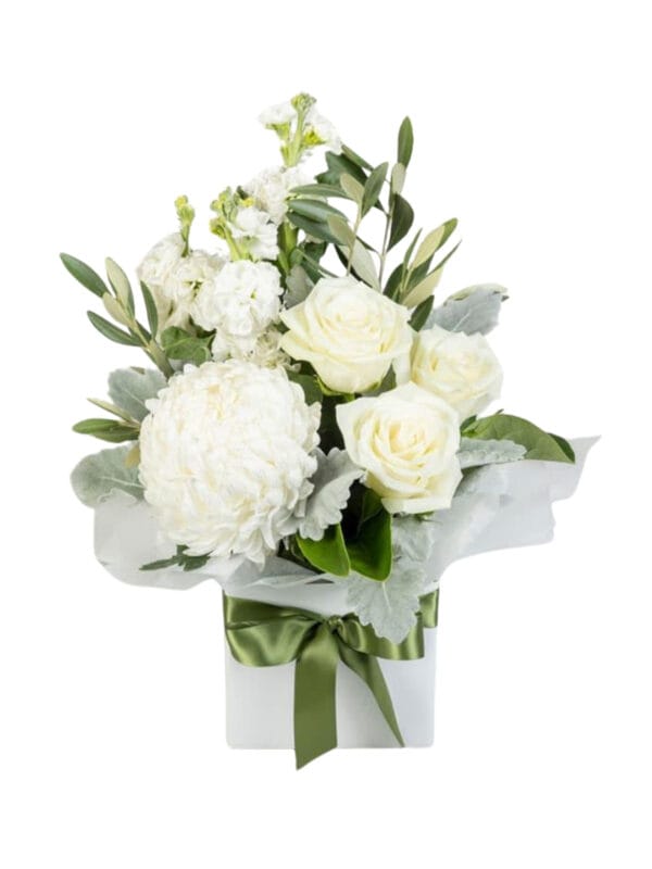A delicate mix of white roses, white chrysanthemums, and white snapdragons with fresh greenery, beautifully presented in a stylish box. Perfect for weddings, sympathy, or any occasion needing a touch of pure elegance. Comes with a card and ribbon.
