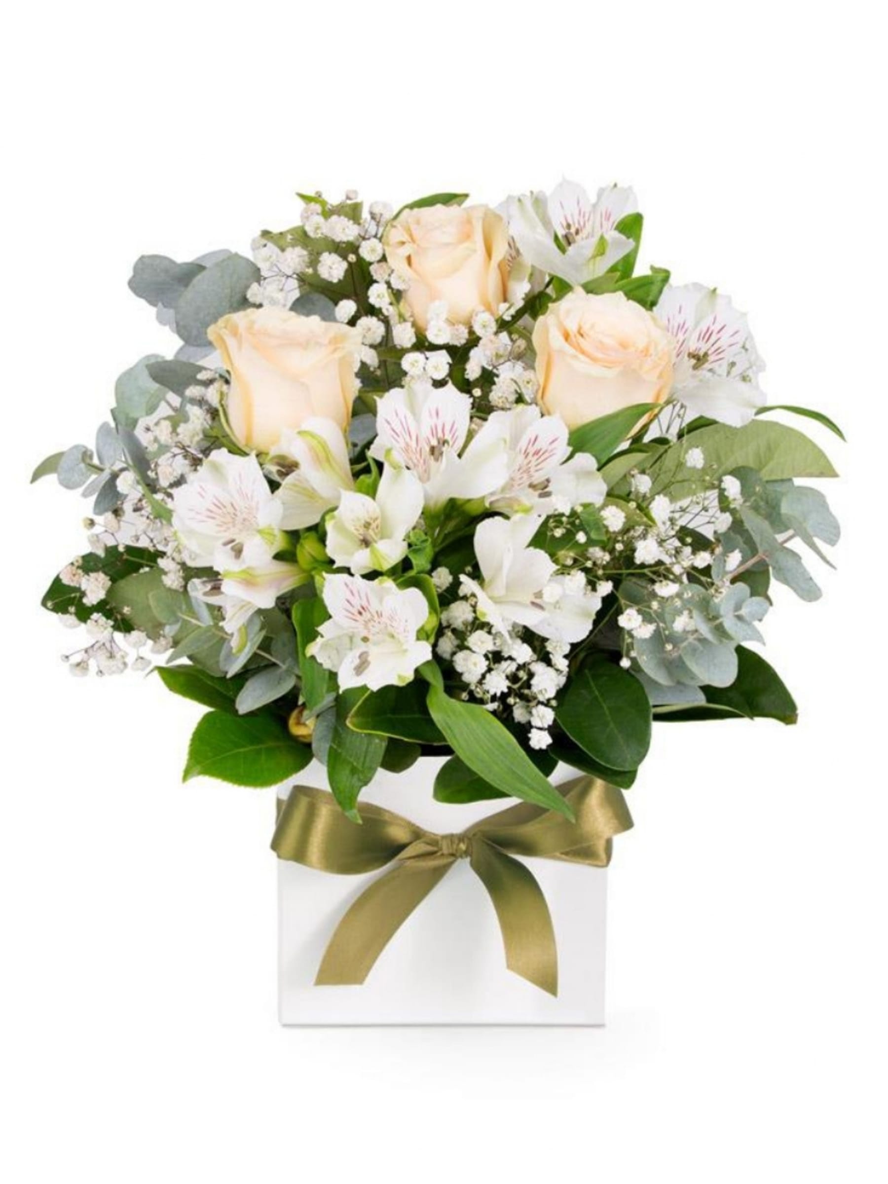 Graceful and timeless, our Elegant White & Cream Rose Box Arrangement is a sophisticated floral gift featuring cream roses, white alstroemeria, gypsophila, and soft greenery. Presented in a stylish gift box with a satin ribbon, this arrangement blends purity with elegance.