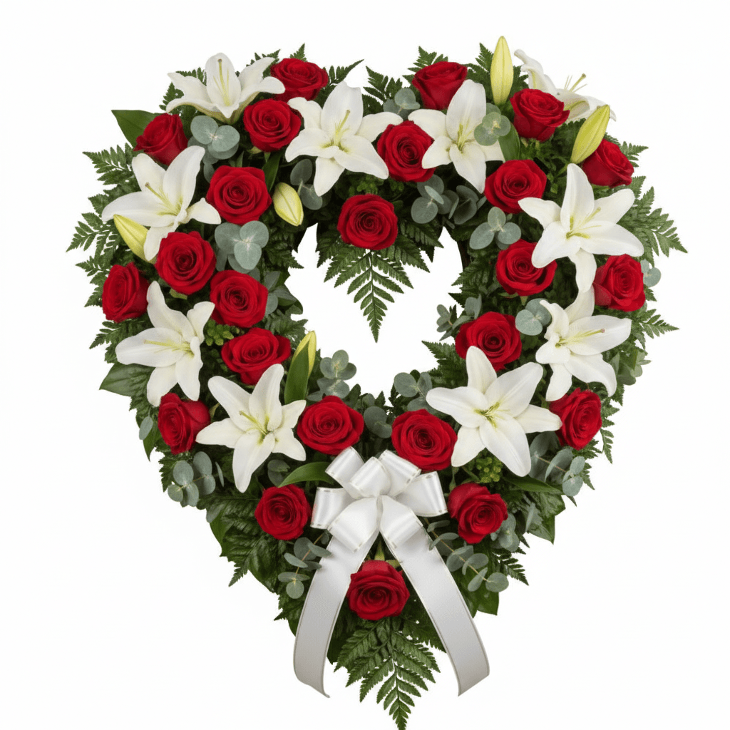 Express a heartfelt tribute with the Everlasting Love Heart Wreath, a stunning arrangement designed in the shape of a heart to symbolize eternal love and remembrance. Featuring elegant white lilies and classic red roses nestled in lush greenery, this floral tribute radiates grace, beauty, and deep affection. Accented with a delicate white ribbon, it’s a perfect gesture of sympathy to honor someone dearly missed.