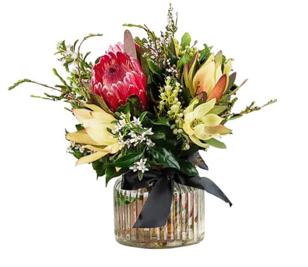 A beautiful jar filled with fresh, seasonal Australian native flowers arranged in a natural, rustic style. Featuring a mix of textured foliage, banksia, protea, wax flowers, and gum leaves, this arrangement celebrates the earthy beauty and resilience of native blooms.