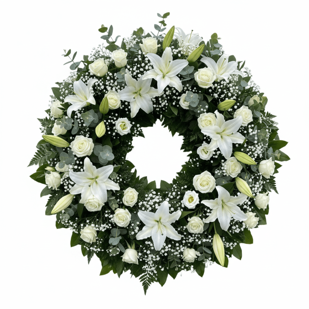Whether you’re honoring a loved one or sending condolences, this wreath beautifully reflects comfort and respect.