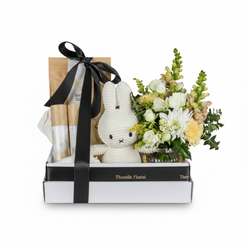 Welcome a precious new arrival with this beautifully curated New Baby Gift Box from Thornlie Florist. This elegant set includes a soft Miffy plush toy, luxury baby bath essentials, and a fresh bouquet of seasonal flowers, all thoughtfully arranged in a premium gift box tied with a sleek black satin ribbon.