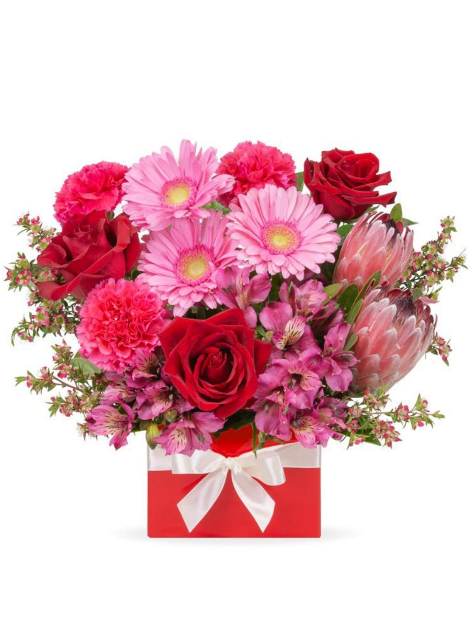 Brighten someone’s day with our Pink Radiance Flower Box, a delightful mix of fresh seasonal blooms in pink and red tones. This elegant arrangement includes roses, gerberas, carnations, alstroemeria, protea, and lush greenery, beautifully presented in a stylish gift box with a satin ribbon.